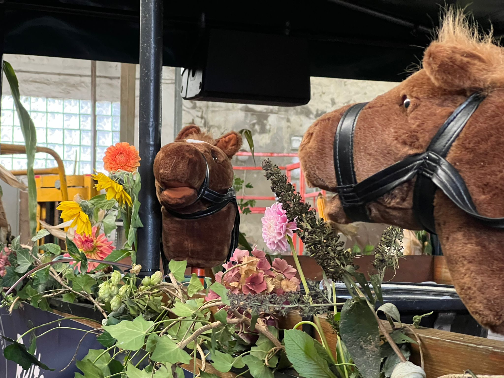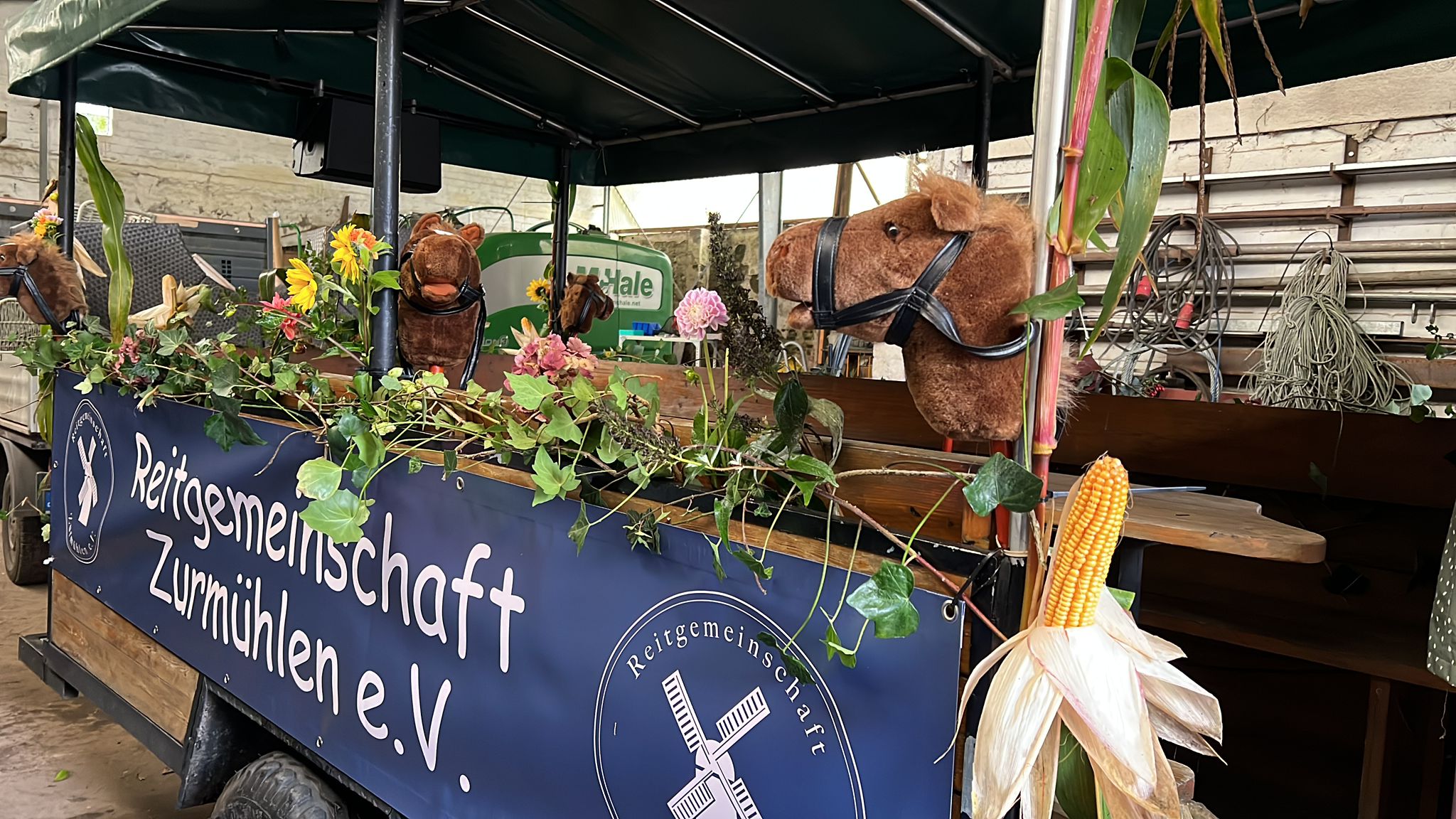 Am Samstag haben wir uns um 13 Uhr getroffen, um den Bollerwagen und den Trecker zu schmücken. Sonnenblumen, Dahlien, Hortensien, Mais, Efeu, Wein und anderes Grün - alles musste an den Wagen und den Trecker. Nicht zu vergessen unsere Steckenpferde und die neuen Banner!
